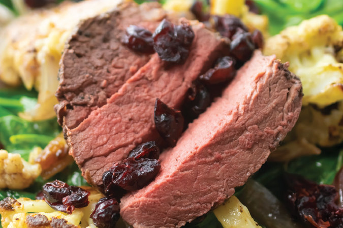 Serve by layering spinach topped with cauliflower and shallots then sliced tenderloin. Garnish with dried cranberries.